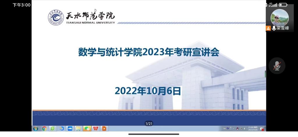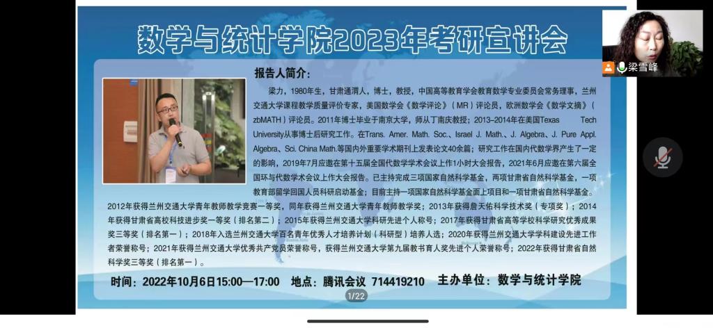 10月6日下午,澳门十大信誉好的网站邀请兰州交通大学数理学院副院长梁力教授通过腾讯会议作了考研专题宣讲,学院领导班子、2019级考研学生及2020级有考研意向学生共100余人参加,会议由学院分管教学工作领导主持。