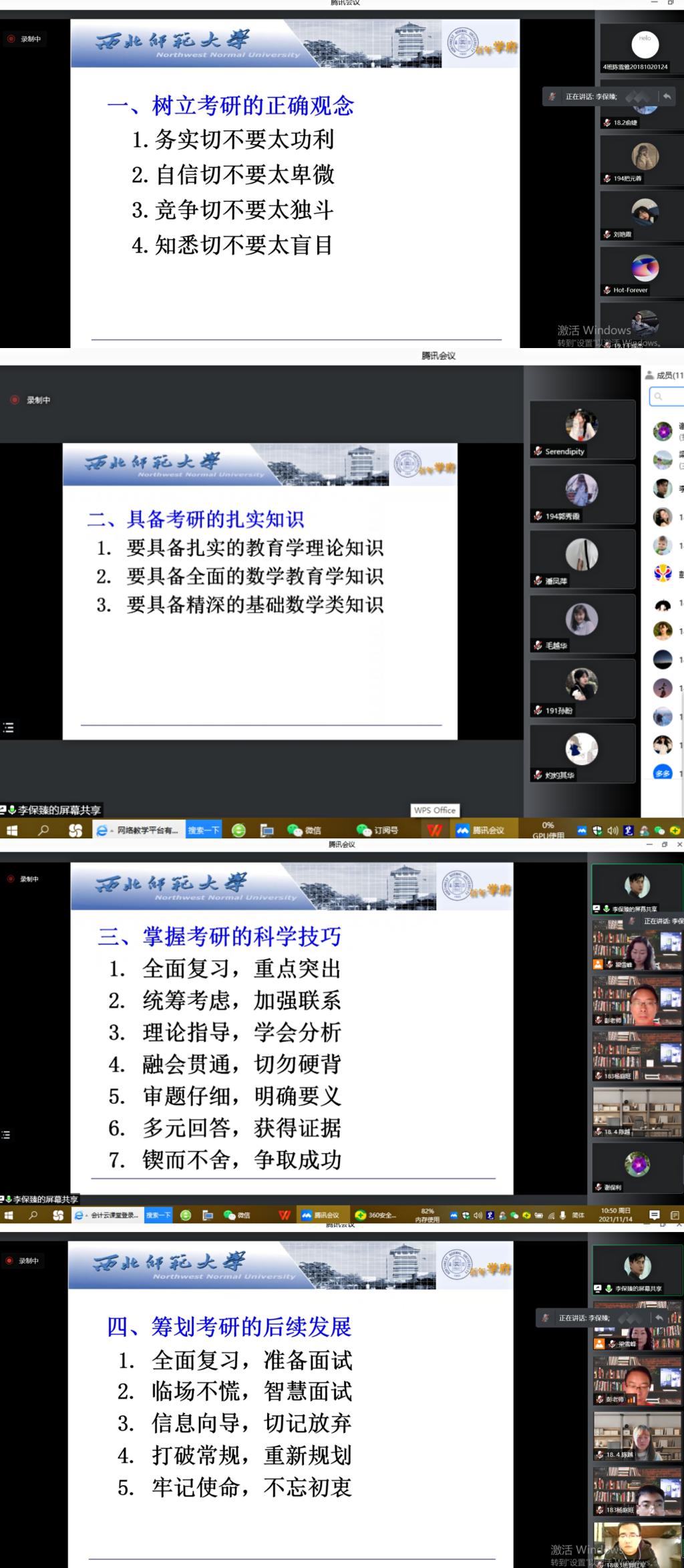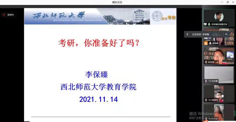 2021年11月14日,应澳门十大信誉好的网站邀请,西北师范大学李保臻教授通过腾讯会议作了题为《考研,你准备好了吗?》辅导报告。18级报考专硕同学、19级准备考研同学、学院领导及部分感兴趣的教师共120余人参加,会议由学院分管教学领导主持。