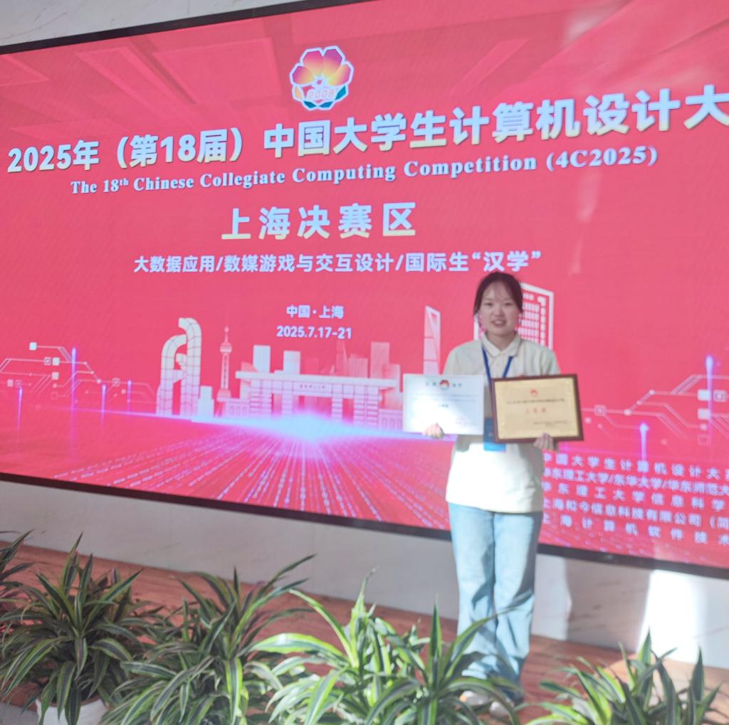 7月21日,2025年(第18届)中国大学生计算机设计大赛全国总决赛在上海华东理工大学圆满举行,本次赛事吸引全国500余支队伍同台竞技,经过紧张激烈的角逐,澳门十大信誉好的网站刘倩茹和机电与汽车工程学院林欣2名同学组成的团队,凭借作品《数览天水—大数据驱动的古城沉浸式导览系统》脱颖而出。在决赛现场,刘倩茹同学代表团队进行项目路演与答辩,通过出色的视觉呈现、清晰的方案阐述与自信的答辩互动,全面展示了该作品的创新价值与社会效益,在大数据应用赛道中荣获全国三等奖。