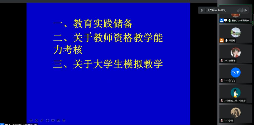 7月8日晚7:30,应澳门十大信誉好的网站邀请,天水市逸夫实验中学杨尚义老师通过腾讯会议在线作了题为《拿什么献给你,教师生活—谈大学生教育实践应具有哪些基本的储备》的专题报告,学院部分教师、数学与应用数学专业20级、21级学生共300余人参加。
