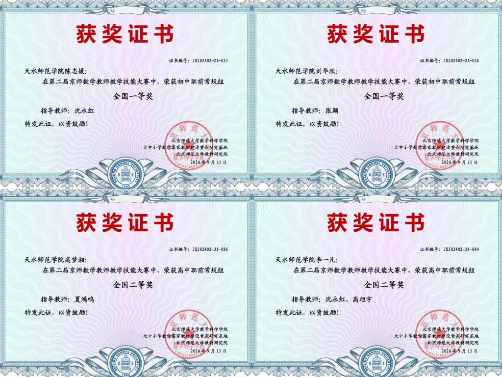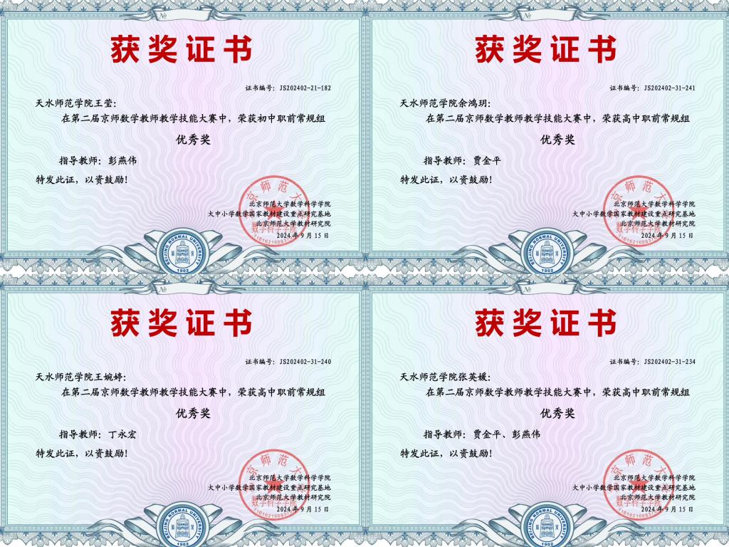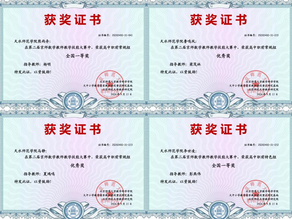 近日,第二届京师数学教师教学技能大赛结果揭晓,澳门十大信誉好的网站学生在比赛中取得优异成绩,获教学技能大赛常规组全国一等奖3项、二等奖2项、优秀奖6项,特色组全国一等奖1项;天水师范学院获最佳组织奖。